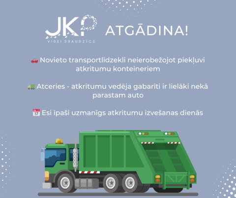 Svētku laikā, kad daudzi izvēlas pavadīt vairāk laika mājās un automašīnas bieži netiek pārvietotas, īpaši svarīgi ir pievērst uzmanību to novietošanai, jo īpaši daudzdzīvokļu namu pagalmos un piebraucamajos ceļos. Pilnsabiedrība JKP vērš uzmanību , ka nepareizi novietots transportlīdzeklis var būtiski apgrūtināt vai pat pilnībā liegt piekļuvi atkritumu konteineriem, radot neērtības visiem apkārtējiem, it īpaši vietās ar šauriem piebraucamajiem ceļiem vai ierobežotu manevrēšanas iespēju, kur atkritumu vedējam traucē veikt pagriezienus vai piekļūt konteineru novietnei. Pilsētas tīrība un kārtība ir atkarīga no mūsu kopīgās atbildības.